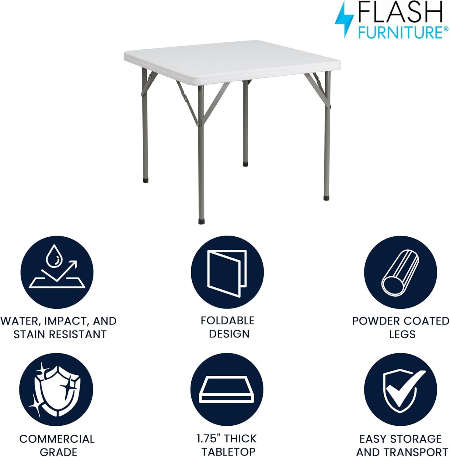 The Flash Furniture Elon 2.85' Square All-Occasion Plastic Folding Event Table is the perfect solution for adding extra surface space at any indoor or outdoor event. This sturdy table seats up to 4 people, features a waterproof and impact-resistant top, and folds easily for transport and storage with locking legs for extra security. With no assembly required and a 220 lb. weight capacity, it's ideal for parties, business gatherings, and more—making it a must-have for any occasion.