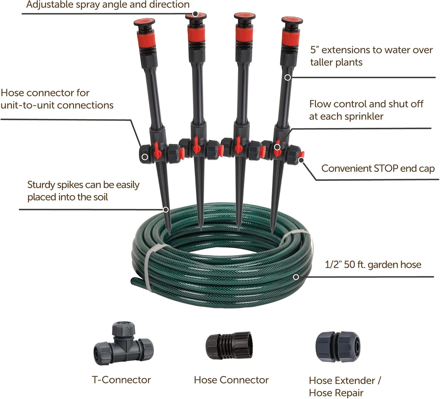 - Fully Adjustable Design: Sprinkler heads rotate 5° to 360° with individual water flow and spray controls—ideal for a multi adjustable sprinkler setup.