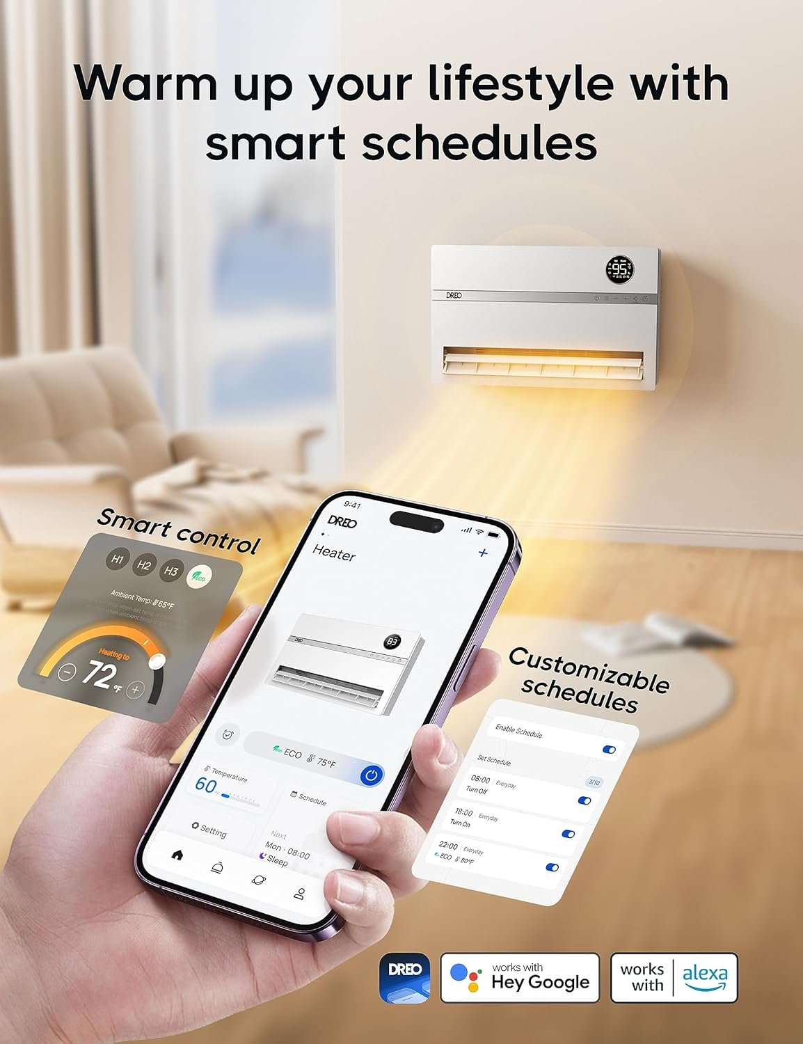 The Dreo Smart Wall Heater is a powerful 1500W electric space heater designed for bedrooms and indoor spaces, offering 120° vertical oscillation to evenly distribute warmth. With smart controls via the Dreo app, Alexa, and Google Home, you can easily customize your heating schedule and settings from anywhere. Featuring ultra-quiet operation, precise temperature control, and user-friendly installation, this DREO heater is perfect for efficient, hassle-free comfort in rooms up to 200 sq. ft. as a primary source—making it an ideal upgrade for any home.